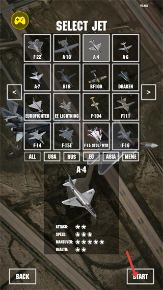 2、選擇戰機如A4,查看其攻擊、速度、機動性、生命值等屬性,點擊START開始游戲,不同戰機屬性差異明顯,可根據戰斗需求選擇。