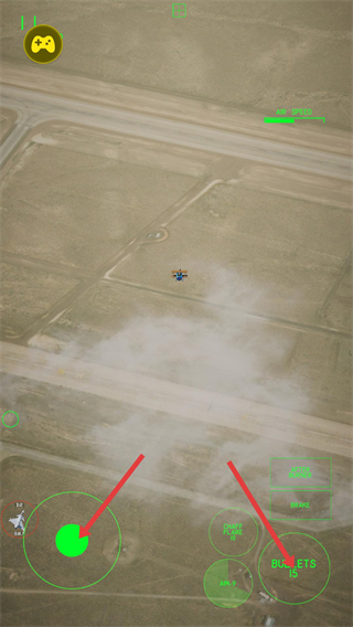 4、在戰斗中點擊綠色操控區域移動飛機,點擊BULLETS按鈕使用機槍射擊,消滅敵方飛機。