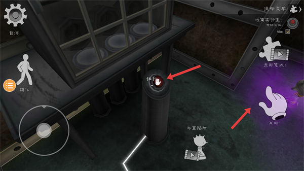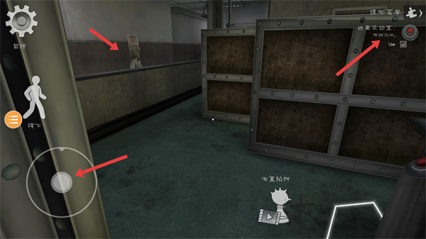 2、在實驗室場景中利用左側虛擬搖桿移動注意躲避遠處的角色,按照右側提示菜單的任務要求推進逃離實驗室的任務。