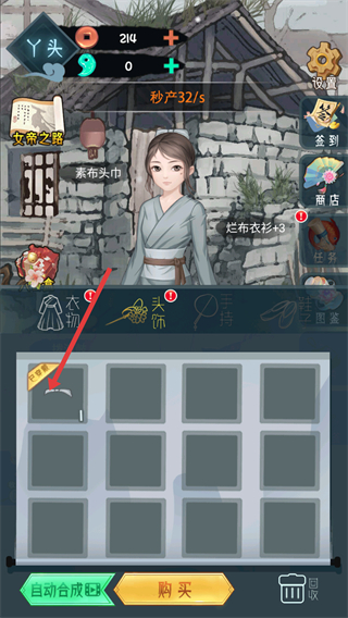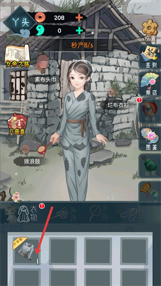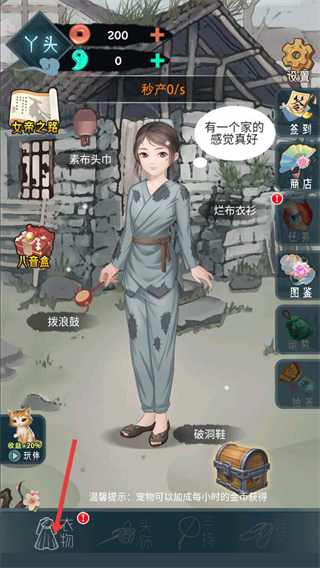 1、點擊衣物選項,查看并穿戴衣物如爛布衣衫,提升角色屬性,增加金幣秒產。