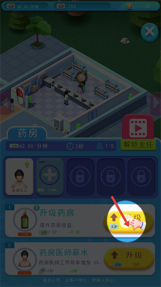 2、升級藥房,提升藥房收益,同時升級藥房醫師薪水,提高醫師工作效率,保障藥品供應與醫療服務質量。