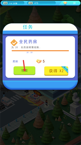 1、完成全民藥房任務為20名藥房顧客結賬后,可獲得5顆鉆石的獎勵,這些鉆石可用于升級醫院設施、提升員工能力等,助力醫院的進一步發展。