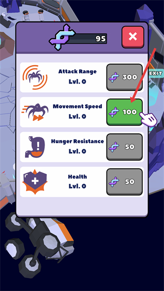 1、在屬性升級界面優先升級移動速度,消耗100資源提升移動速度等級助力游戲進程。