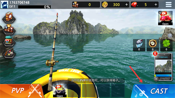 1、在釣魚游戲界面點擊CAST按鈕拋竿開始釣魚,界面顯示等級、金幣和鉆石數量。