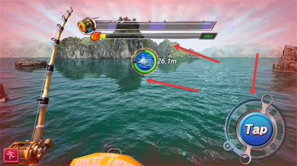 3、釣到魚后關注魚的距離和魚竿的狀態持續點擊Tap按鈕控制魚竿,逐步將魚拉近距離注意保持操作節奏避免魚逃脫。