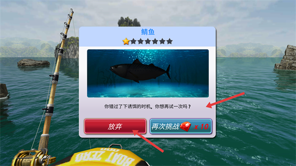 4、若錯過下誘餌時機會出現提示框可選擇放棄或再次挑戰,若選擇放棄可重新開始釣魚。