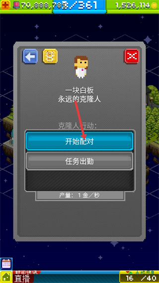 3、點擊開始配對,進行克隆人基因配對,提升克隆人產能如1金秒,增加城市經濟收益。