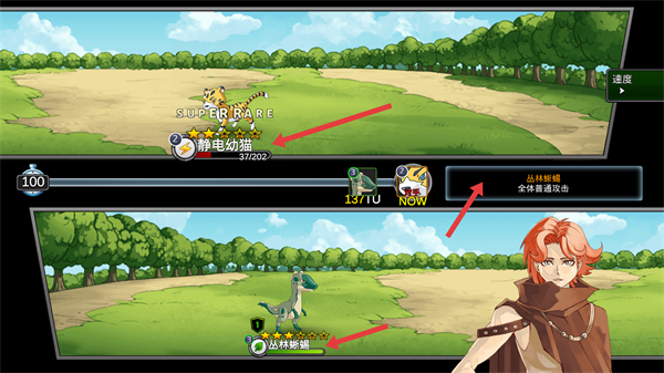 2、戰斗時要合理運用怪獸的技能如叢林蜥蜴的全體普通攻擊,面對敵方怪獸靜電幼貓時選擇合適的技能攻擊。