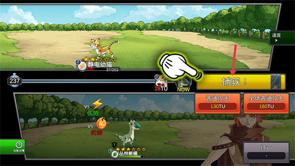 3、遇到可捕獲的怪獸時可先通過攻擊削弱其血量再點擊捕獲按鈕嘗試捕獲,像面對靜電幼貓時利用己方怪獸的屬性優勢攻擊后及時選擇捕獲操作。