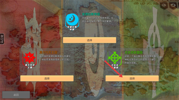 1、在地圖界面選擇對應國家,點擊選擇按鈕確定勢力,開啟對應國家的經營與發展流程。