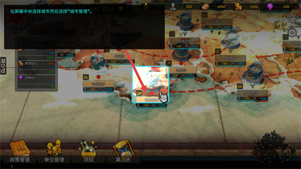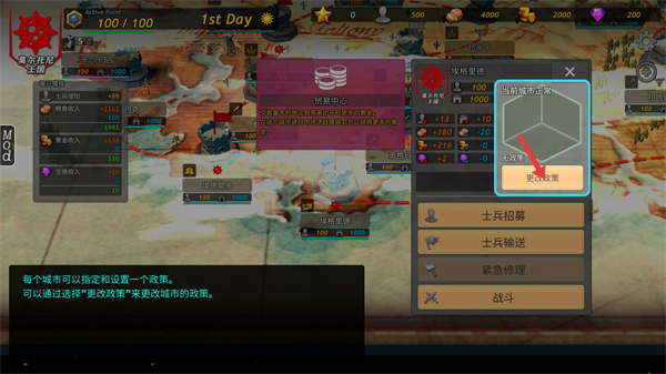 3、點擊城市建筑打開功能菜單,選擇變更政策可調整城市的發展傾向,每個城市能指定首個政策以適配戰略。