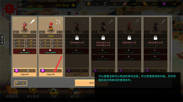 4、進入單位管理界面,點擊Upgrade按鈕消耗資源升級已解鎖單位如士兵、偵察兵,提升其作戰能力。