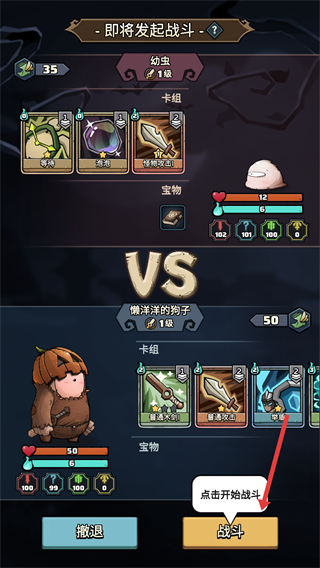 3、即將發起戰斗時點擊戰斗按鈕開始對決,戰斗前可查看敵我雙方的卡組和屬性制定合適的戰斗策略。