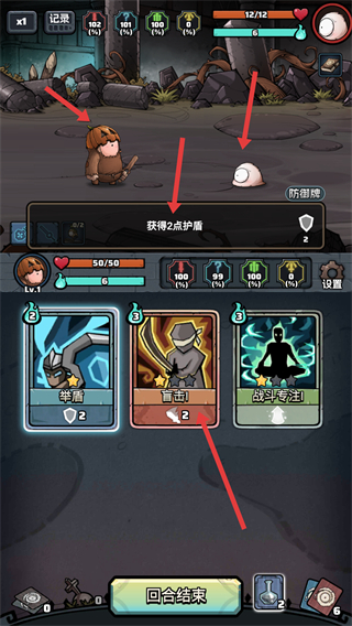 4、戰斗中合理使用卡牌如舉盾可獲得護盾,盲擊可造成傷害根據戰局靈活選擇卡牌提升戰斗勝率。