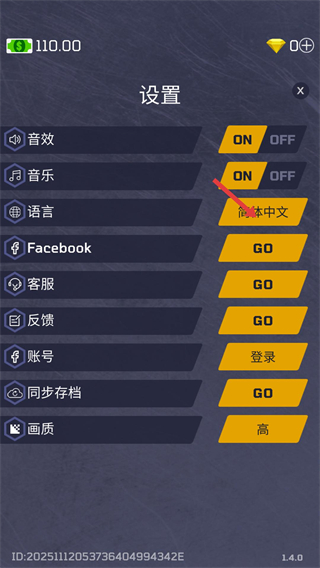 2、在設置界面可調整音效、音樂的開關狀態,也能切換語言,按需配置以提升游戲體驗。