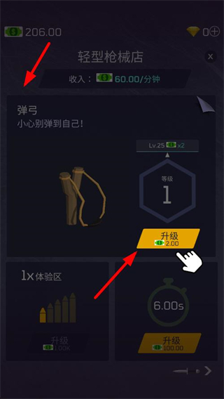 1、進入輕型槍械店界面,可查看彈弓的等級和收入,消耗對應資源點擊升級按鈕,提升彈弓等級,增加每分鐘的收入收益。