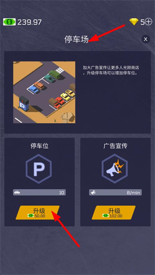 4、進入停車場界面,可升級停車位或廣告宣傳,消耗資源點擊升級按鈕,增加車位或提升宣傳效果,吸引更多顧客。