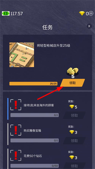 2、打開任務界面,可查看將輕型槍械店升至25級等任務,完成對應進度后,可獲取對應的獎勵,推進店鋪的經營進程。