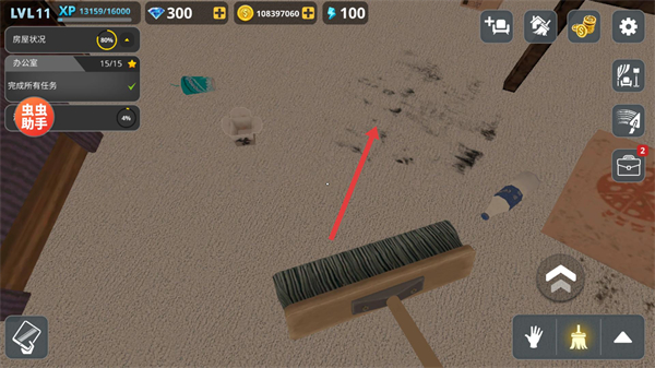 2、使用掃帚工具清理地面污漬與垃圾,完成清潔環節,提升辦公室的整潔度與完成任務的進度。