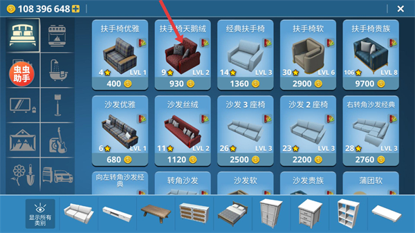 3、在家具商店選擇扶手椅天鵝絨,消耗930金幣解鎖該家具,用于裝飾辦公室提升場景完成度。