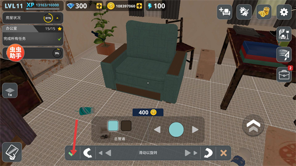 4、消耗400金幣放置扶手椅優雅,調整其位置適配辦公室布局,逐步完善場景裝飾以達成整理目標。