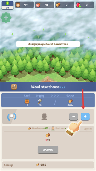 2、點擊加號按鈕可分配人員砍伐樹木,獲取木材資源為營地建設和發展提供材料。
