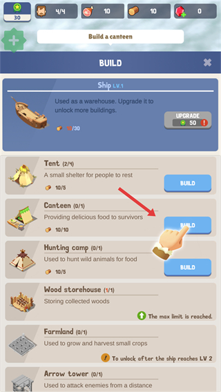3、在建造界面點擊食堂的建造按鈕,消耗木材可建造食堂為幸存者提供食物保障生存需求。