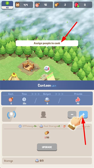1、在食堂界面會看到分配人員做飯的提示,點擊右側加號按鈕,分配人員負責烹飪,以此獲取食物資源,保障生存需求。
