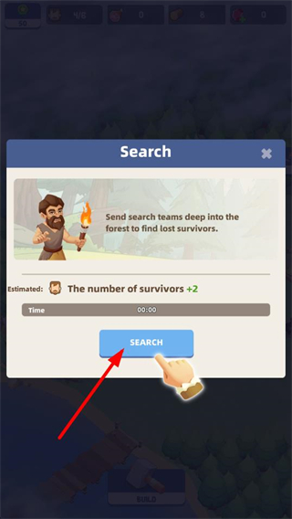 4、打開搜索界面,點擊搜索按鈕,派遣搜索隊深入森林,尋找失聯的幸存者,成功后可增加幸存者數量,壯大營地人員規模。