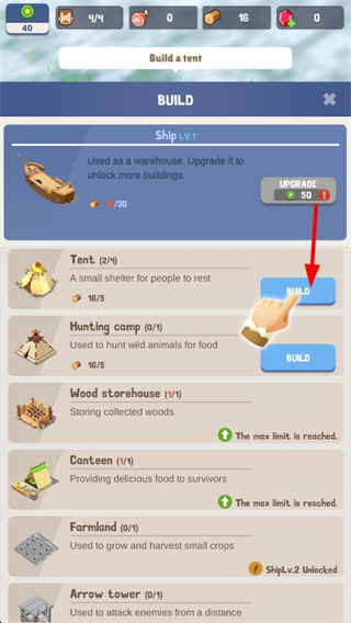 2、進入建造界面,看到搭建帳篷的提示,找到帳篷選項點擊建造按鈕,建造帳篷作為人員休息的庇護所,完善生存設施。