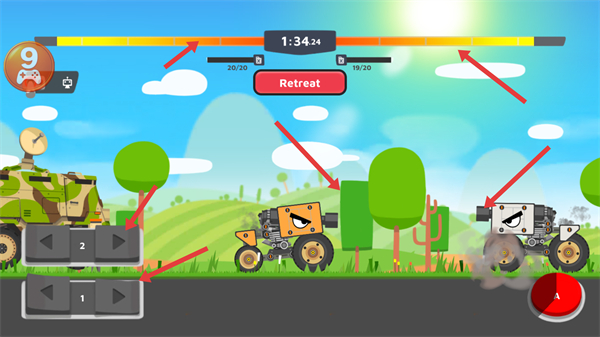 3、在對戰中操作方向按鈕控制坦克移動,利用地形和時機攻擊敵方坦克同時關注上方的對戰進度條把握戰局。