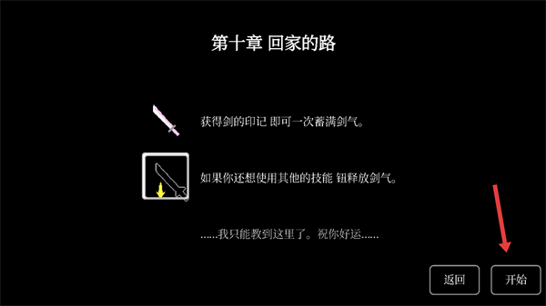 1、第十章回家的路開始前,了解獲得劍的印記可一次蓄滿劍氣,釋放劍氣可使用其他技能,點擊開始進入關卡挑戰。