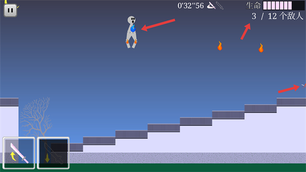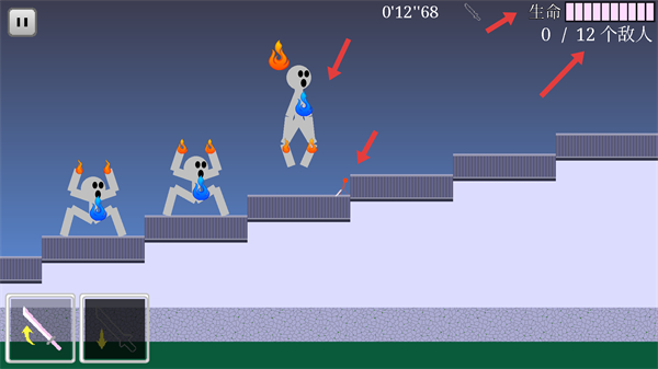 2、進入關卡后注意生命條和需擊敗的敵人數量,利用技能攻擊帶有火焰和藍色火焰的敵人,逐步推進關卡進度。