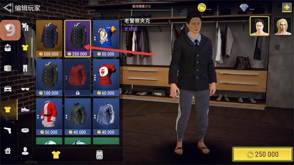 3、選擇老警察夾克等服飾,消耗250000貨幣完成購買并穿戴,解鎖對應裝扮效果。