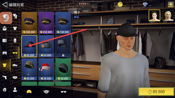 4、切換至帽子分類,選擇對應款式如85000貨幣的帽子,完成頭部裝飾的更換。