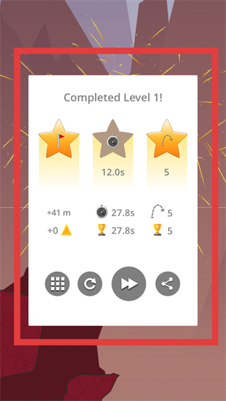 4、完成關卡后會顯示關卡完成信息,包括星級、時間等獎勵,可選擇繼續下一關或重玩,不斷挑戰提升攀爬成績。
