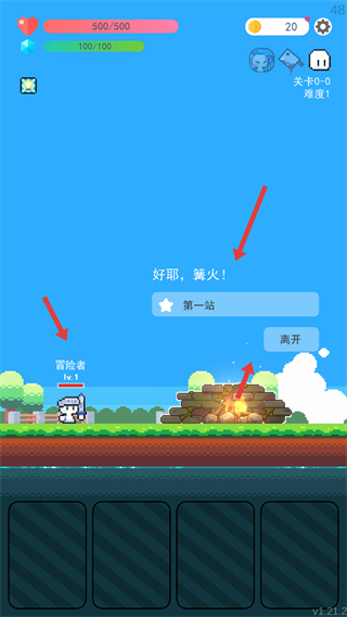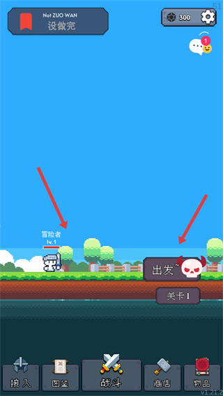 1、操控lv1的冒險者點擊出發開啟冒險,進入關卡挑戰,積累經驗提升等級,推進游戲進程。