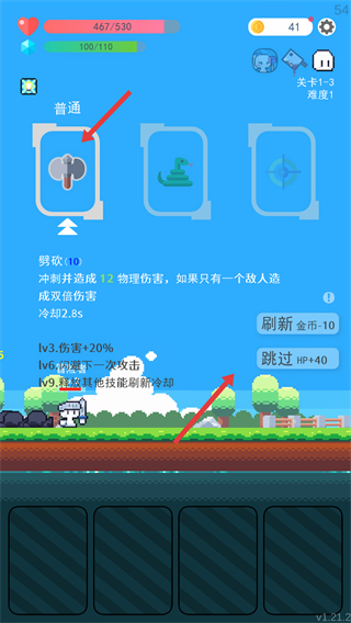 4、選擇劈砍等技能,利用技能效果造成高額傷害,也可選擇刷新技能或跳過恢復HP,根據戰斗情況靈活操作,高效通關。