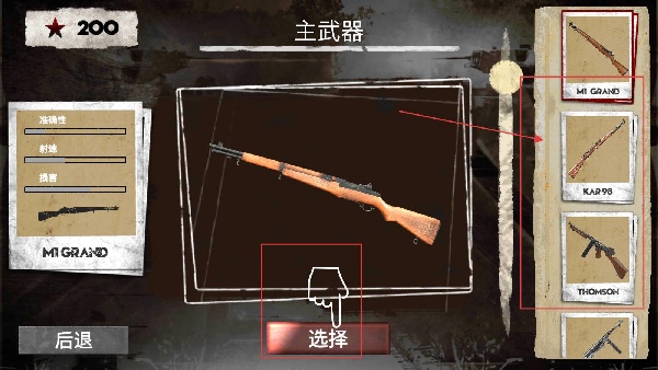 1、主武器選擇M1Grand步槍,該步槍準確性和傷害表現良好,適合中遠距離戰斗,點擊選擇按鈕裝備該武器。