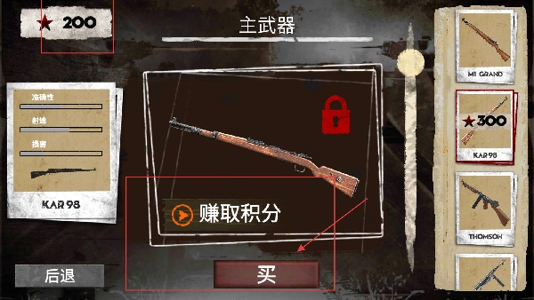 2、KAR98步槍需要300積分解鎖,其傷害較高,適合精準狙擊,可通過完成任務賺取積分后購買,提升遠距離戰斗能力。