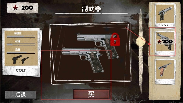 4、副武器選擇Colt雙槍,需要200積分購買,該武器火力密集,可作為主武器的補充,在近距離戰斗或主武器彈藥不足時使用。