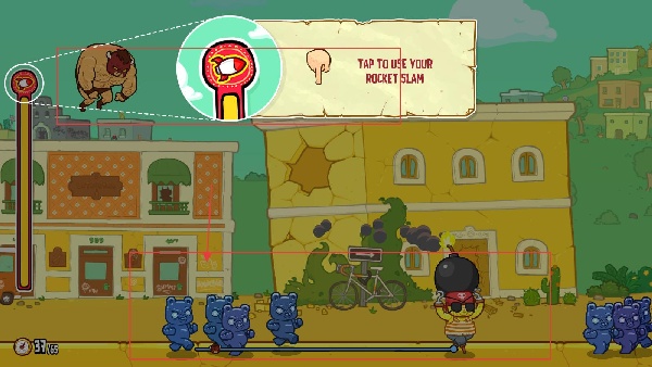 1、跑酷時點擊火箭slam技能按鈕,操控角色發動強力攻擊,可對敵人造成大范圍傷害,有效清理密集的藍色小熊敵人。