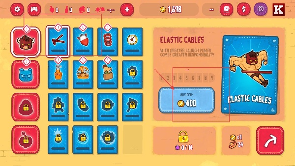 4、玩家可在商店界面使用金幣購買彈性繩索等道具,提升角色的彈射力量,增強戰斗和移動能力,助力挑戰更高難度的關卡。