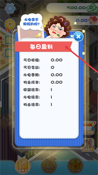 1、關注每日盈利界面,了解收租、支出、水電費用等數據,合理規劃房產經營,確保收益最大化,積累更多資金。
