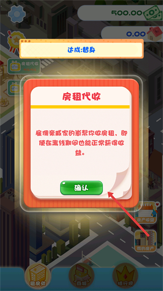 2、開啟房租代收功能,雇傭親戚家的崽幫忙收房租,即使離線也能獲得收益,點擊確認啟用該功能,提升收益穩定性。
