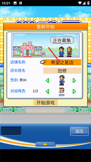 1、在重新開始界面,可設置店鋪名稱希望之星店、店長姓名田修等信息,選擇后點擊開始游戲進入經營流程。