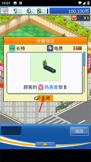 4、查看設備信息長椅,其功能是恢復顧客的熱衷度,點擊關閉完成查看,合理布置設施可優化顧客體驗。