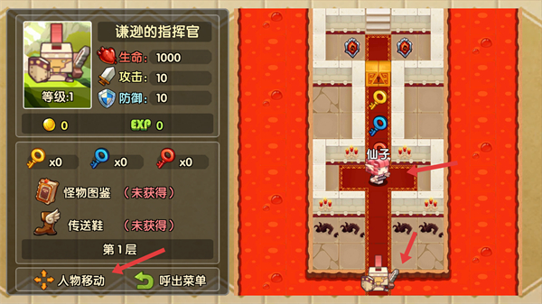 2、進入游戲后通過人物移動按鈕操控角色在第一層移動,探索場景中的仙子和怪物區域,熟悉地圖布局。