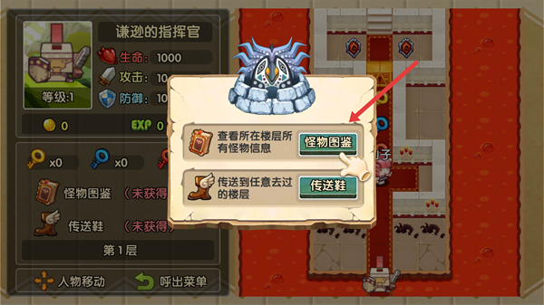3、遇到功能選擇界面時可根據需求選擇怪物圖鑒查看怪物信息,或選擇傳送鞋實現樓層傳送,助力冒險進程。