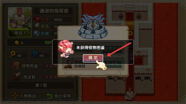 4、當彈出未獲得怪物圖鑒提示時,點擊確定按鈕關閉提示,繼續在第一層探索,積累資源和經驗,為后續冒險做準備。